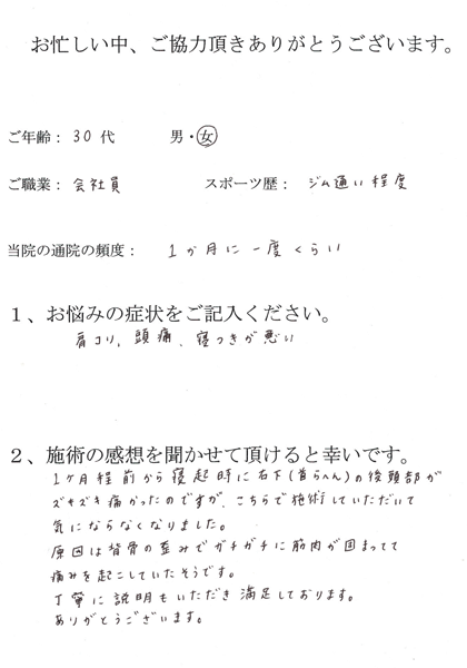 ●お悩みの症状:肩こり、頭痛、たまに腰痛、右指の痛み